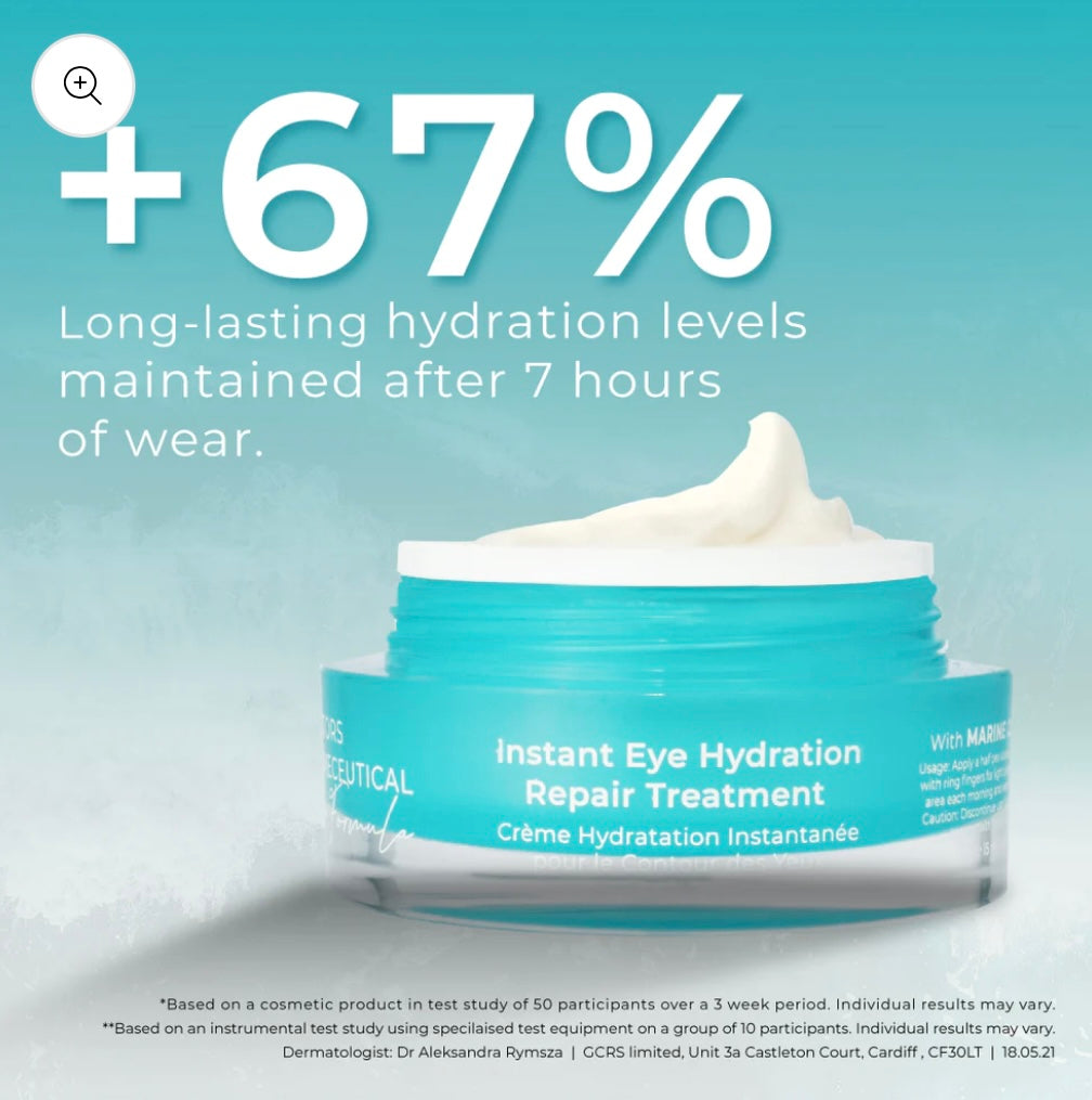 Our Instant Eye Hydration Repair contains a unique blend of Marine Collagen, Soluble Collagen and mineral rich marine water. This eye repair is designed to bring a boost of hydration to the under-eye area.